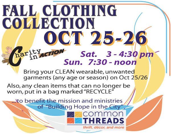 Charity In Action will collect CLEAN, wearable, unwanted clothing (all ages and seasons) to benefit "Building Hope in the City"